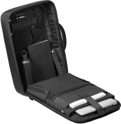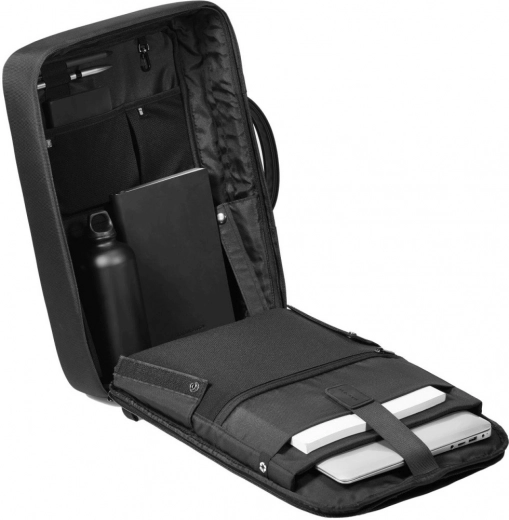De rugzak heeft vakken voor een stadspas of documenten in de schouderbanden en ergonomische EVA-schuimvulling voor comfort. Het hoofdvak opent in een hoek van 180° en bevat een organiser en reflecterende elementen voor betere zichtbaarheid. Het laptopvak is tot 16" en het tabletvak tot 12,9".