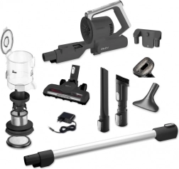 De uitrusting omvat een speciale PET‑mond voor dierenharen, een SOFA‑mond (bekleding), kierenaccessoires en een opzetstuk voor boeken en delicate oppervlakken. De wandhouder maakt het opbergen van de stofzuiger en accessoires eenvoudig, terwijl batterijbescherming tegen oververhitting en een voorfilter de levensduur van het toestel verlengen.