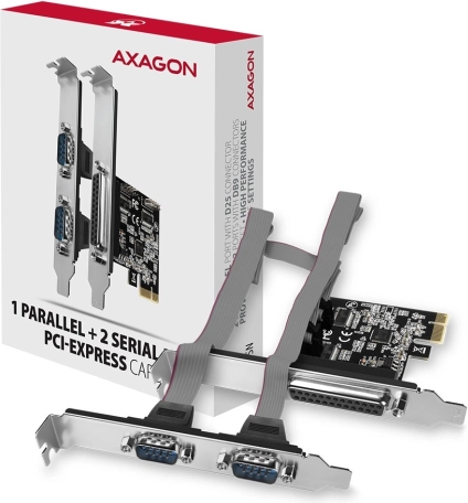 Breid je desktop uit met betrouwbare industriële poorten met de AXAGON PCEA‑PSN kaart. Biedt 1× parallelle LPT (DB25) direct op de kaart en 2× seriële RS232 (DB9) op een aparte slotplaat, hoge compatibiliteit dankzij de ASIX AX99100 chipset, overdracht tot 250 kBd en ondersteuning voor Plug & Play. In de verpakking zitten ook standaard- en low‑profile slotplaten voor verschillende behuizingen.