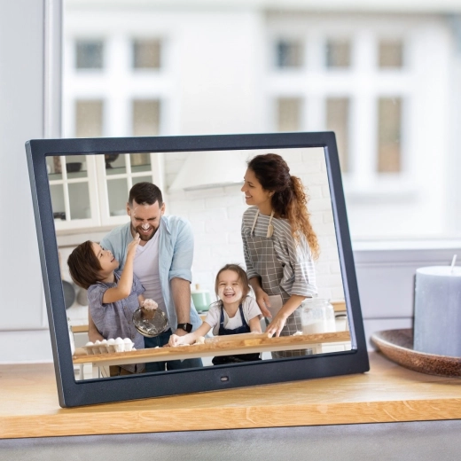 Stijlvolle en moderne digitale fotolijst van 15 inch, ideaal voor het weergeven van je favoriete foto’s in HD-kwaliteit.