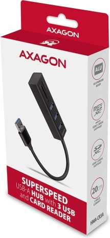 De AXAGON HMA-CR3A-hub is vervaardigd uit hoogwaardig aluminium, wat zorgt voor een hoge mechanische bescherming bij frequent gebruik. De oppervlakteafwerking minimaliseert vingerafdrukken en rubberen pads voorkomen wegglijden op het tafeloppervlak. Hij is uitgerust met een USB-kabel van 20 cm, ideaal voor gebruikers van mobiele apparaten.