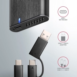 De AXAGON-behuizing is uitgerust met een moderne USB‑C-connector voor betrouwbare verbinding en wordt geleverd met een USB‑C -> USB‑C-kabel en een USB‑C -> USB‑A-adapter. Zo kunt u hem eenvoudig aansluiten op een laptop, computer of zelfs een mobiel apparaat.