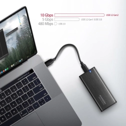 Ondersteunt snelheden tot 10 Gb/s en is achterwaarts compatibel met USB 3.1 en USB 3.0. De behuizing maakt het uitlezen van S.M.A.R.T.-gegevens mogelijk, ondersteunt UASP, TRIM en heeft een standbyfunctie voor een langere levensduur van de schijf.