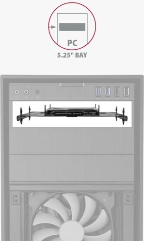 - Afmetingen van het frame en de montagelopeningen komen overeen met een standaard 5,25" bay in de pc-behuizing.