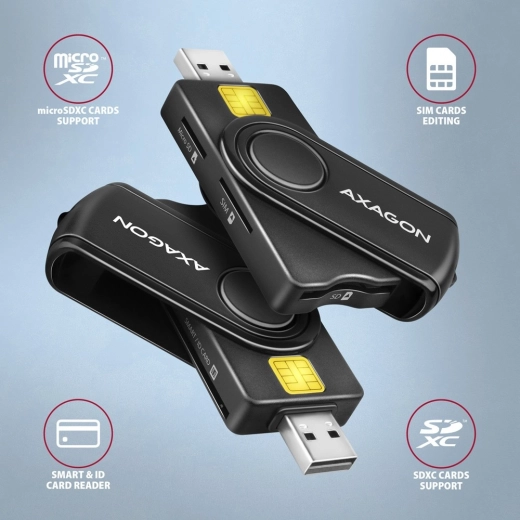 De kaartlezer AXAGON CRE-SMP2A is een uitstekende oplossing voor het beheren van elektronische contactkaarten en geheugenkaarten. Biedt de volgende opties: