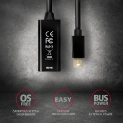 De actieve mini DisplayPort → HDMI-adapter AXAGON RVDM-HI14N is een betrouwbare oplossing voor het aansluiten van HDMI-displays op computers met mini DisplayPort. Zorgt voor een hoogwaardige videotransmissie tot 4K/30 Hz en draagt tevens digitale audio over. Dankzij de compacte afmetingen past hij ook in krappe ruimtes en is er geen externe voeding nodig.