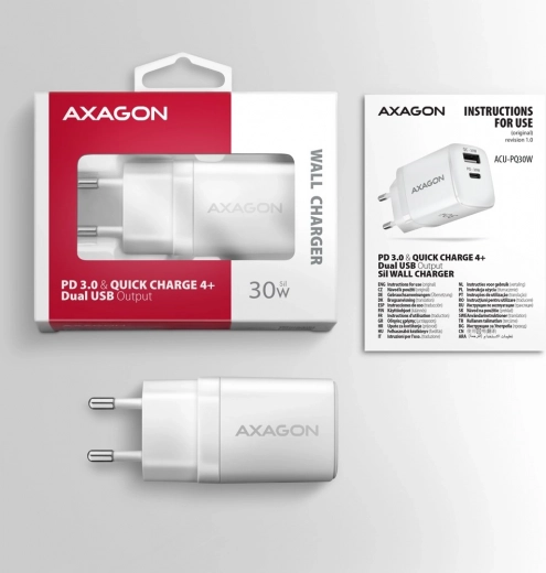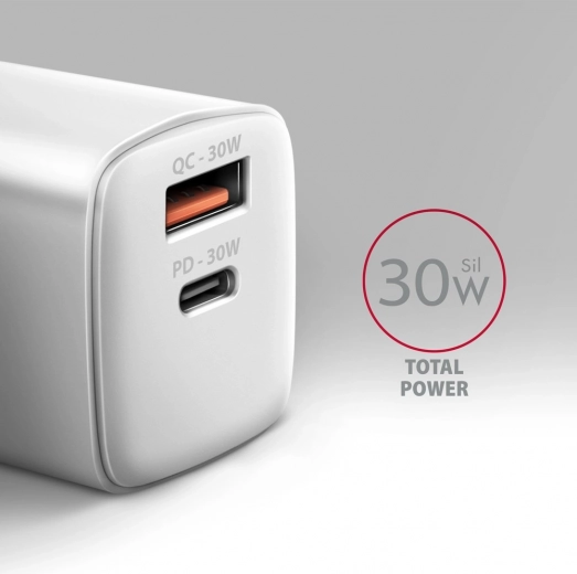 Snelle en veelzijdige lader voor smartphones, tablets en kleinere laptops. De USB‑C PD 3.0 / QC 4+ en USB‑A QC 3.0 uitgangen leveren tot 30 W bij afzonderlijk laden en slimme vermogensverdeling bij het gelijktijdig laden van twee apparaten. Ondersteuning voor PPS zorgt voor optimale spanning en stroom voor moderne smartphones.