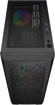 De Fornax 400X is een elegante miditower die focust op strak design en efficiënte luchtstroom. Het geperforeerde frontpaneel met stoffilter en de vooraf geïnstalleerde ARGB-ventilatoren zorgen voor uitstekende koeling en aantrekkelijke lichteffecten die je eenvoudig afstemt op de rest van je componenten.