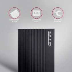 Het gebruik van een geribbelde aluminium behuizing draagt bij aan effectieve koeling en bescherming van de schijf, terwijl rubberen voetjes stabiliteit op het oppervlak bieden. Het elegante ontwerp voorkomt ongewenste vingerafdrukken.