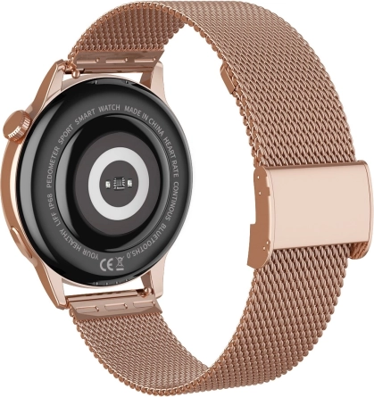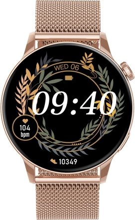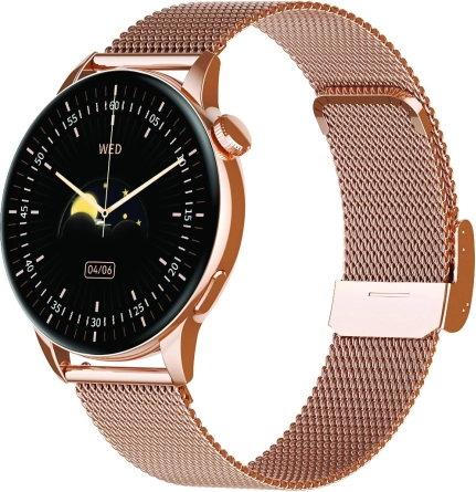 Deze smartwatch valt op door het gouden design en de premium afwerking die de aandacht trekt.