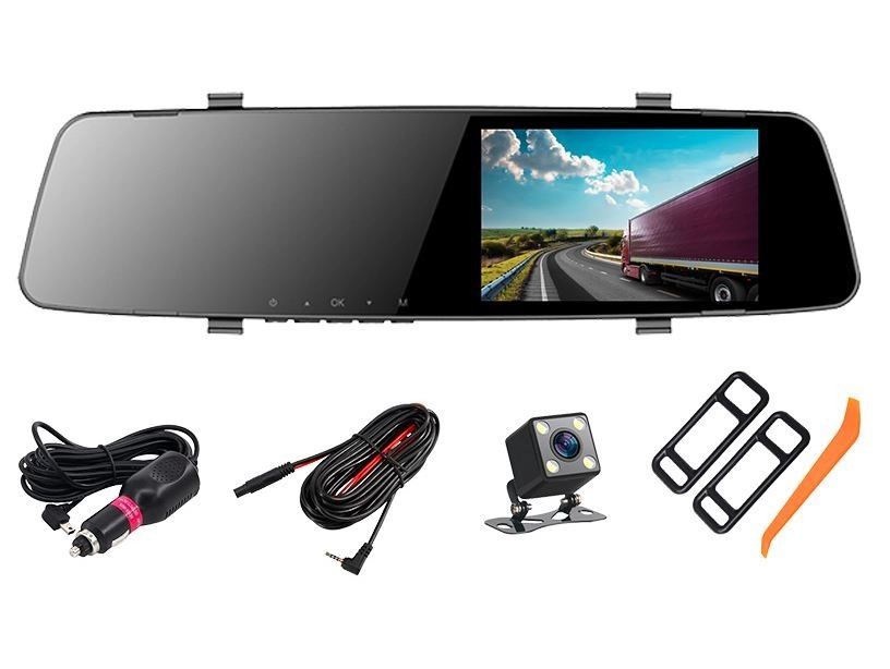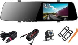In de set zit een achtercamera die helpt bij het parkeren en tevens continu vastlegt wat er achter het voertuig gebeurt. De G-sensor vergrendelt bij een botsing automatisch cruciale beelden, de parkeerstand activeert opnemen bij een stoot of trilling en de bewegingsdetectie start de opname zodra er iets in het zichtveld gebeurt. De ingebouwde microfoon voegt helder geluid toe aan de video.