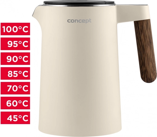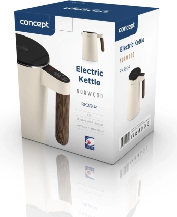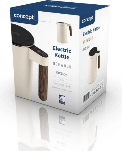 Breng stijl en comfort in je keuken. De Concept Norwood waterkoker combineert een moderne matte look in vanille met een elegant “houten” handvat. Dankzij de inhoud van 1,5 l zet je eenvoudig tot 6 kopjes van je favoriete drankje. De dubbele wand met Cool Touch-oppervlak blijft koel aan de buitenkant, terwijl de roestvrijstalen binnenkan het water snel en efficiënt verwarmt.