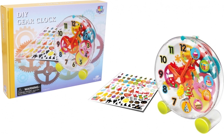 De klok werkt na montage op basis van een mechanisch mechanisme, dat zowel leerzaam als leuk is. In de verpakking zitten decoratieve stickers, waarmee je het design naar wens kunt afwerken.