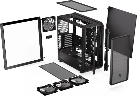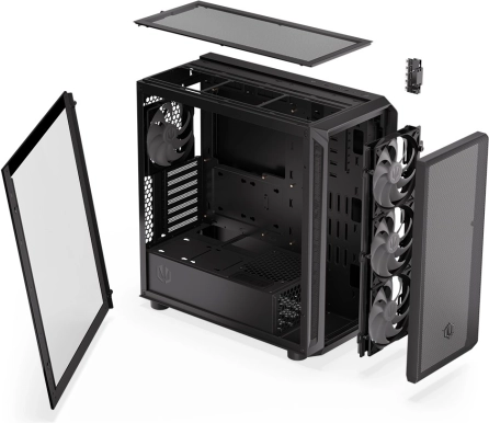 In de doos zitten 4 Stratus 140 PWM ARGB-ventilatoren die esthetische lichteffecten toevoegen en tegelijk zorgen voor efficiënte koeling van je componenten. De voor- en bovenpanelen met fijn gaas zorgen voor een optimale luchtstroom, zodat je systeem koel en stabiel blijft.