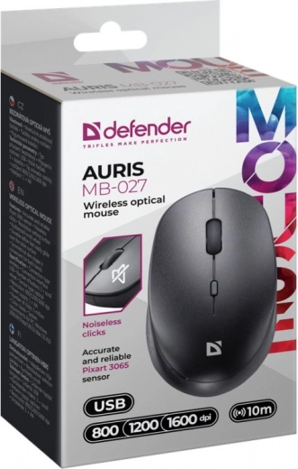 Geniet van comfortabele bediening met de draadloze muis DEFENDER Auris MB-027, met stille klik, een nauwkeurige PixArt optische sensor en schakelbare DPI 800/1200/1600 voor soepel werken en ontspannen gebruik.