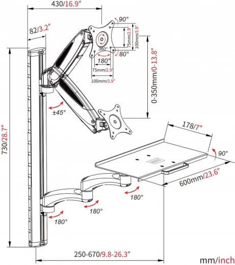 - Ergonomische flexibiliteit: onafhankelijke hoogteverstelling van beide armen op het draagprofiel (hoogte 73 cm).