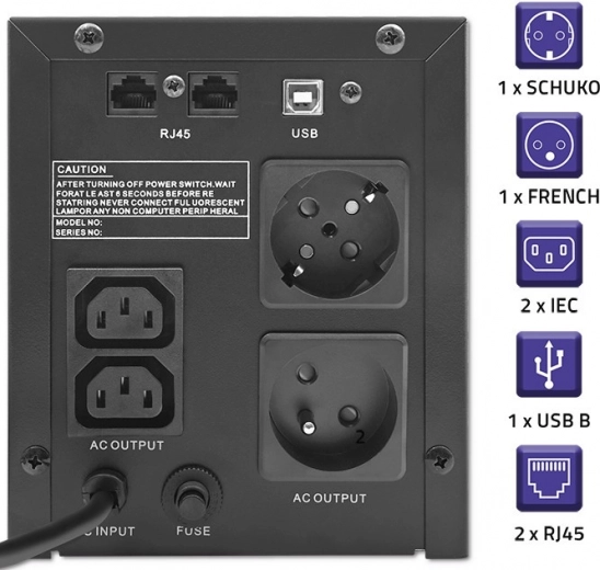 Tot de andere uitstekende functies behoort de automatische spanningsregeling (AVR), die niet alleen stabiele voeding en een lager batterijverbruik garandeert, maar ook bescherming biedt tegen te hoge of te lage spanning. De cold start-functie maakt het mogelijk het apparaat uitsluitend met behulp van de UPS op te starten. Uiteraard zijn er ook beveiligingen tegen overbelasting en kortsluiting, en een USB-poort voor monitoring en beheer van de energievoorziening.