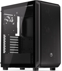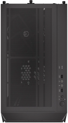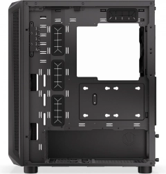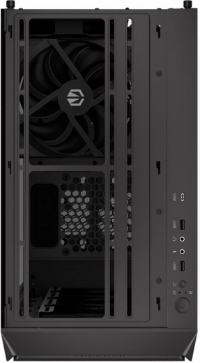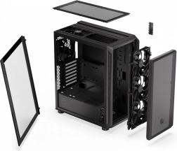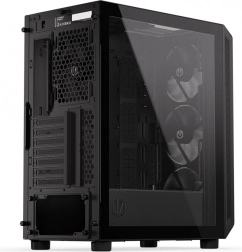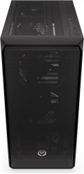 De behuizing is uitgerust met een doorzichtig zijpaneel van gehard glas, wat zichtbaarheid van de interne componenten mogelijk maakt.