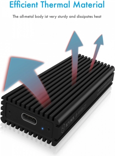 ICY BOX externe behuizing is perfect ontworpen voor krachtige NVMe M.2 SSD's, met een hogesnelheids USB 3.1 (Gen 2) Type-C verbinding die gegevensoverdracht met snelheden tot 10 Gbit/s mogelijk maakt. De stevige aluminium constructie zorgt voor duurzaamheid en efficiënte warmteafvoer.