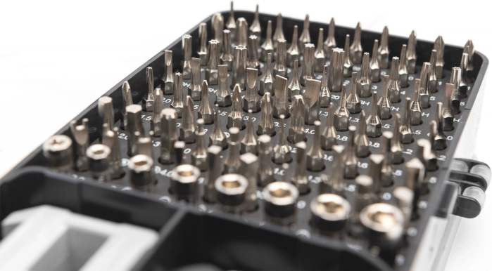Diverse vormen en maten bits voor alle gangbare schroeven in elektronica en fijne mechanica – van kruis- en sleuf tot Torx en Pentalobe.