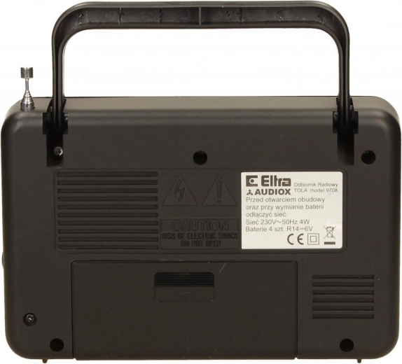 Compacte draagbare radio TOLA in een elegante zwarte kleur biedt ontvangst van langegolf (LW) en FM/UKW. Hij kan worden gevoed via het lichtnet 230 V of op batterijen, heeft een praktisch handvat voor eenvoudig dragen, een telescoopantenne voor betere ontvangst en een hoofdtelefoonaansluiting voor ongestoord luisteren.