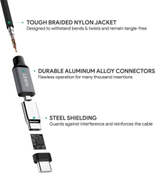 De duurzame nylon vlecht beschermt de kabel tegen knikken en slijtage, en de lengte van 2 meter biedt gemak thuis, op kantoor en in de auto. Compatibiliteit met Quick Charge 4.0/3.0/2.0 en AiPower‑technologie zorgt voor breed inzetbare compatibiliteit met USB‑C‑apparaten.