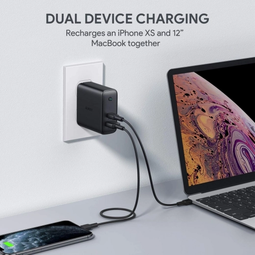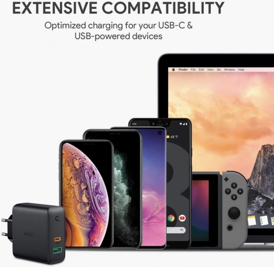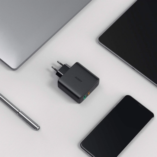 Laad je apparaten snel en efficiënt op met de AUKEY PA-D3 lader. Twee poorten – USB-C Power Delivery en USB-A – dekken alles af van telefoons en oordopjes tot krachtigere apparaten, inclusief laptops en via USB-C gevoede monitoren. De Dynamic Detect-technologie verdeelt het vermogen intelligent: bij één aangesloten apparaat tot 60 W, bij twee apparaten optimaliseert hij de verdeling (bijv. tot 45 W voor de primaire poort) voor snel en veilig opladen.