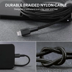 Duurzame AUKEY laad- en datakabel met Lightning- en USB‑A‑connectoren van 2 m biedt snelle gegevensoverdracht tot 480 Mb/s, Apple MFi‑certificering voor 100% compatibiliteit en een gevlochten nylon mantel tegen in de knoop raken voor dagelijks betrouwbaar gebruik.