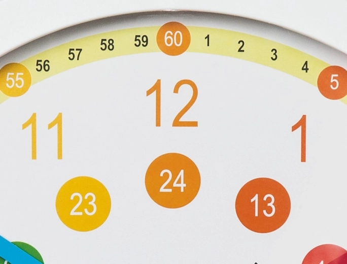 Stimuleer de natuurlijke nieuwsgierigheid van kinderen met een kleurrijke klok die stap voor stap leert klokkijken. Grote Arabische cijfers, kleurcodering en een duidelijke indeling in 12/24 uur en minuten helpen kinderen het principe van tijd aflezen snel te begrijpen.