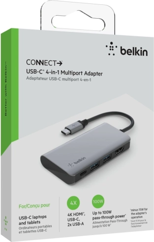 Verbind je laptop of tablet met meerdere apparaten via een compacte USB‑C 4‑in‑1 hub. Biedt 4K HDMI bij 30 Hz, 2× USB‑A voor randapparatuur en opladen, en USB‑C met pass-through voeding tot 100 W. De elegante aluminium behuizing is ideaal voor kantoor, thuis en onderweg, en de 5 Gb/s snelheid zorgt voor snelle gegevensoverdracht.