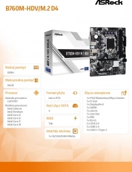 De ASRock B760M‑HDV/M.2 D4 is een betrouwbaar microATX‑moederbord voor het Intel LGA1700‑platform. Dankzij de B760‑chipset, degelijke voeding en een brede reeks connectors is het een ideale keuze voor zowel gaming‑ als werk‑pc’s, waar u snelle SSD’s, hoge DDR4‑frequenties en moderne video‑uitgangen waardeert.
