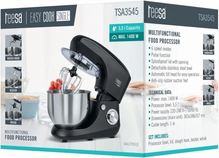 Keukenmachine Easy Cook SINGLE zwart is ontworpen om te voldoen aan al uw kook- en bakbehoeften. Met zijn robuuste constructie, bestaande uit een combinatie van metaal en kunststof, kan hij gemakkelijk ook veeleisende taken aan. Het mengen van ingrediënten is eenvoudiger dankzij de kantelbare kop die gemakkelijk toegang tot de kom mogelijk maakt.