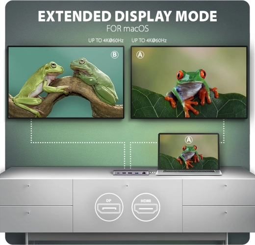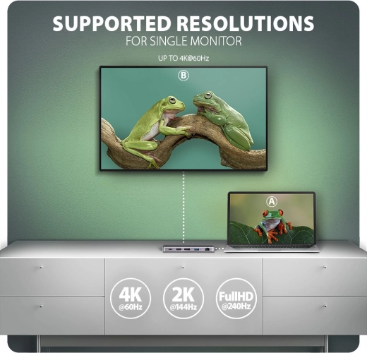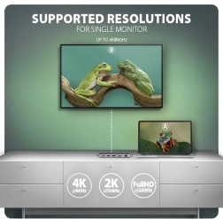 Creëer een compacte werkplek met één kabel. De hub biedt 3× USB‑A (2× 5 Gb/s, 1× 10 Gb/s) en 1× USB‑C 10 Gb/s voor snelle randapparatuur en externe schijven. Sluit beeld aan via HDMI en DisplayPort tot 4K/60 Hz – afzonderlijk of gelijktijdig, inclusief ondersteuning voor HDR en hoge gamingfrequenties (2K/144 Hz, Full HD/240 Hz). De aparte USB‑C PD 100 W-poort met doorvoer stroom bespaart een poort op je laptop.