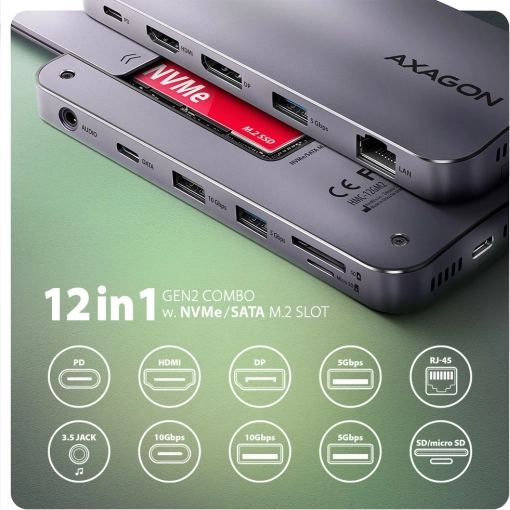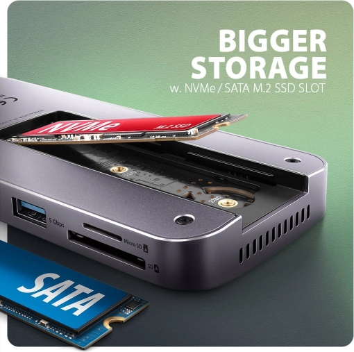 De geïntegreerde M.2‑sleuf verandert de hub in een externe SSD‑behuizing – compatibel met NVMe én SATA, kaarten met M‑key en B+M‑key in de formaten 2242 en 2280. Ondersteunt UASP, TRIM, S.M.A.R.T. en kent geen capaciteitslimiet. Gigabit Ethernet zorgt voor een stabiele verbinding, de SD/microSD‑kaartlezer (gelijktijdig gebruik van beide slots) versnelt het overzetten van foto’s en er is een combi 3,5 mm audio-aansluiting voor hoofdtelefoon/microfoon.