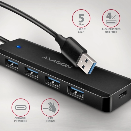 De praktische reis‑hub AXAGON HUE‑C1A voegt direct vier volwaardige USB‑A‑poorten toe met een doorvoersnelheid tot 5 Gb/s voor razendsnelle gegevensoverdracht. De vast bevestigde kabel van 19 cm vergemakkelijkt de aansluiting op laptops en desktop-pc’s, terwijl de compacte behuizing met een gewicht van slechts 37 g in elke tas past.