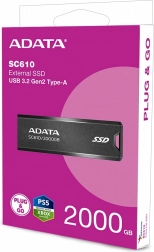 ADATA SC610 is een compacte en draagbare externe SSD-schijf met een hoge capaciteit van 2000 GB. Dankzij de ondersteuning van USB 3.2 Gen2 bereikt hij een doorvoer tot 10 Gb per seconde, wat snelle en efficiënte gegevensoverdrachten mogelijk maakt.