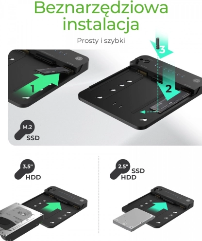 Eenvoudige installatie: Dankzij het gereedschapsloze easy plug-in ontwerp plaatst u 2,5"/3,5" schijven of een M.2 SSD eenvoudig in de sleuf.