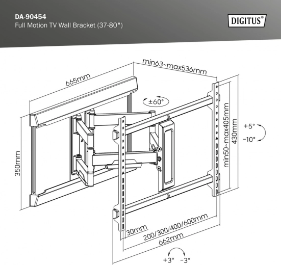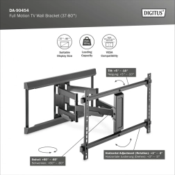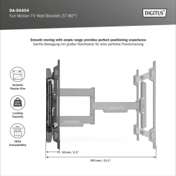De beugel heeft een uittrekbare arm met een bereik van 6,3 tot 53,6 cm, waardoor een optimale kijkhoekinstelling mogelijk is. Draaifunctie van +60 tot -60° en kanteling van +5 tot -10° bieden aanpasbaarheid aan de behoeften van de gebruiker. Horizontale rotatie van +3 tot -3° zorgt voor een nauwkeurige positionering van het scherm.