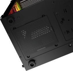 De behuizing ondersteunt waterkoeling en is voorzien van drie stoffilters ter bescherming tegen stof. Het paneel biedt USB-poorten, waaronder twee USB 2.0 en één USB 3.0, voor gemakkelijke toegang en aansluiting van apparaten. Met de meegeleverde ARGB-verlichting kun je de verlichting aanpassen via de bedieningstoets op het bovenpaneel.
