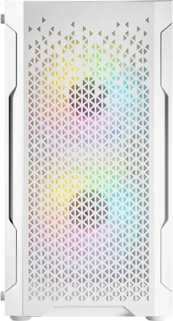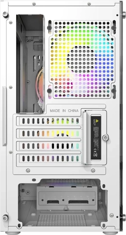 Het geperforeerde frontpaneel en twee voorgeïnstalleerde 120mm ARGB-ventilatoren zorgen voor een uitstekende luchtstroom en aantrekkelijke verlichting. Kleuren en effecten schakel je met de RESET-knop. Indien nodig kunnen aan de voorkant ook 2× 140mm ventilatoren worden geplaatst.