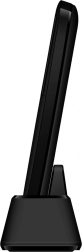 De afbeelding toont een elegant zwart elektronisch apparaat in de vorm van een mobiele telefoon met een oplaadstation.
