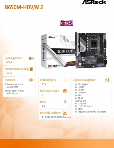 De ASRock B650M-HDV/M.2 combineert het moderne AMD AM5‑platform met uitgebreide connectiviteit en focus op betrouwbaarheid. Dankzij ondersteuning voor DDR5 met hoge frequenties en de Blazing M.2‑sleuf (PCIe Gen5 x4) krijg je topklasse prestaties voor werk en gaming. Geïntegreerde video‑uitgangen HDMI en DisplayPort gebruik je met Ryzen‑APU’s, terwijl de Dragon 2.5G netwerkaansluiting zorgt voor een snelle en stabiele verbinding.