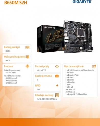Het compacte GIGABYTE B650M S2H-moederbord voor socket AM5 biedt ondersteuning voor AMD Ryzen 7000-processors, modern DDR5-geheugen en M.2 PCIe 4.0-opslag. Het levert stabiele 5+2+2-fase voeding, snelle GbE LAN-netwerkverbinding en uitgebreide connectiviteit met HDMI, DisplayPort en D-Sub. Met Q-Flash Plus en Smart Fan 6 werk je eenvoudig de BIOS bij en blijft het systeem koel en stil.