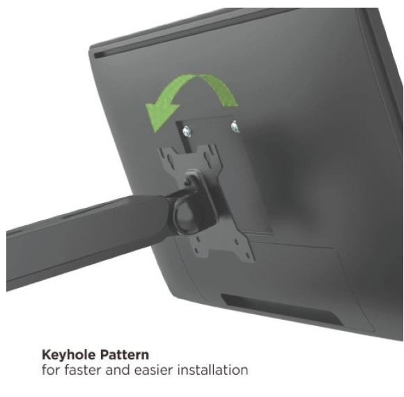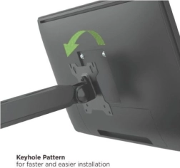 De houder ondersteunt monitors van 17–32" en een gewicht tot 10 kg, en biedt vrij kantelen, een draaibare basis en rotatie voor perfecte weergave vanuit elke hoek. Praktische kabelgeleiding houdt het werkblad overzichtelijk en het sleutelgat-systeem versnelt de montage aanzienlijk.