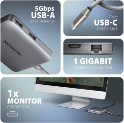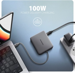 Maak van je laptop een universeel werkstation. Deze multifunctionele USB‑C hub 5‑in‑1 voegt de ontbrekende poorten toe aan moderne laptops en voedt ze tegelijk veilig via Power Delivery 3.0 (tot 100 W). Sluit een monitor aan via HDMI met 4K-resolutie bij 60 Hz, ga het netwerk op via Gigabit LAN (RJ‑45) en koppel randapparatuur via 2x USB‑A 5 Gb/s.