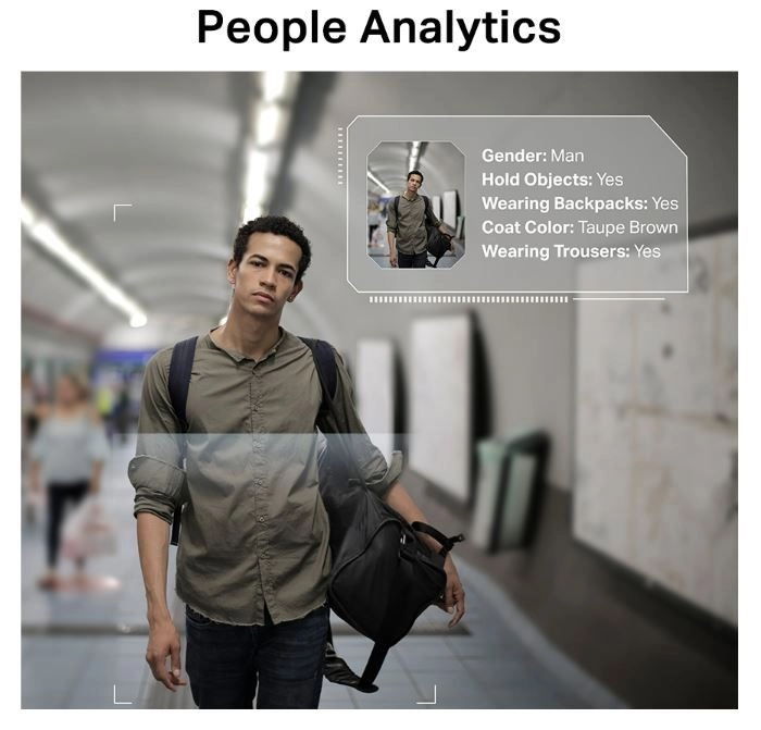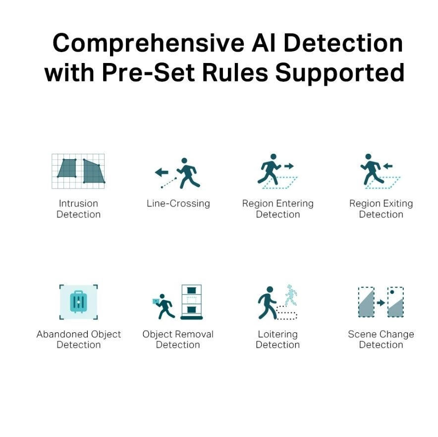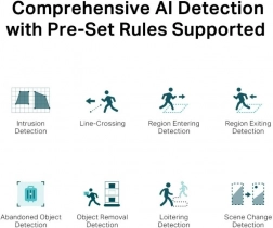 - Classificatie van personen en voertuigen, slimme detectie (lijn, gebied), analyse en snel zoeken