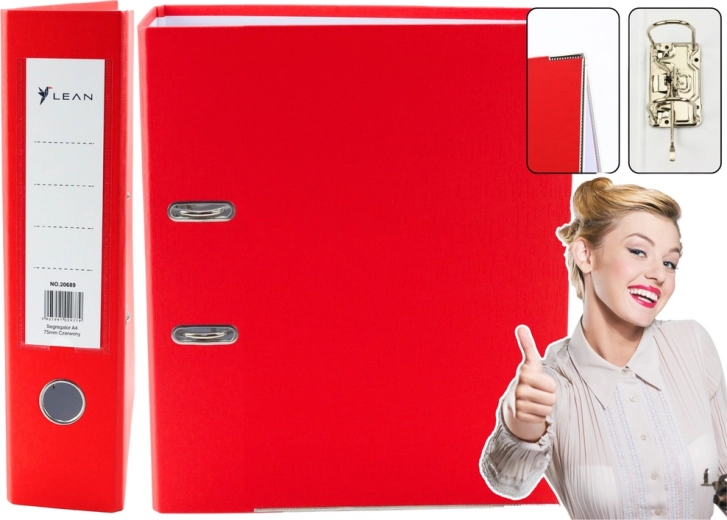 De rode A4-hefboordmap is een ideale keuze voor overzichtelijk en veilig beheer van papieren, facturen en contracten. De duurzame constructie van 2 mm karton met een vernikkeld hefmechanisme garandeert een lange levensduur en soepele omgang met documenten. Een rugetiket voor beschrijving en een metalen vingeruitsparing maken zowel organisatie als het uitnemen uit kasten eenvoudiger.