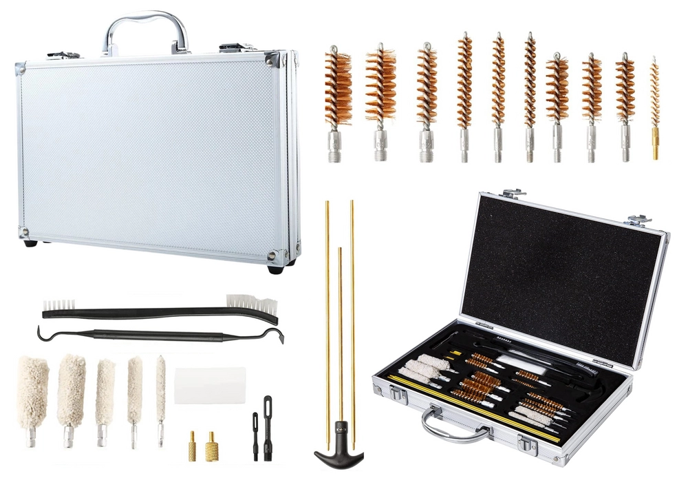 Messing- en katoenen borstels, poetsdoppen, adapters en verlengstangen dekken het volledige onderhoud van loop en mechaniek. Alles wat je nodig hebt in één pakket.