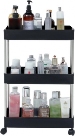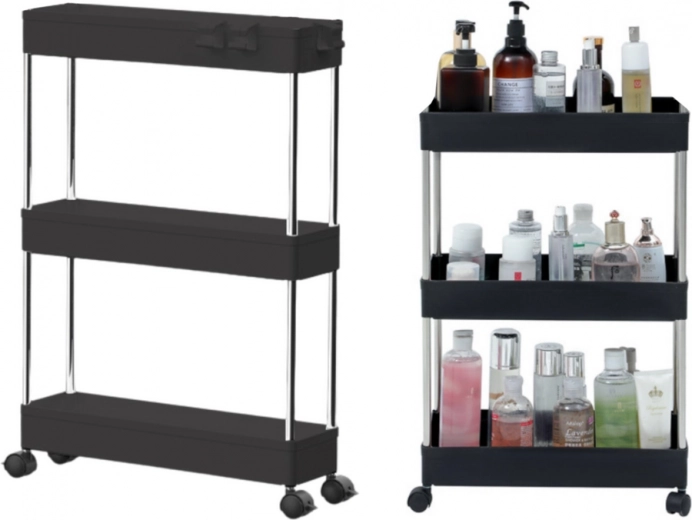 Praktisch verrijdbaar rek met 3 planken in elegant zwart voor eenvoudige organisatie in keuken, badkamer en woonkamer. Dankzij de compacte afmetingen, mobiele constructie op wieltjes en stabiele uitvoering van metaal en duurzaam plastic biedt het overzichtelijke opslag voor kruiden, cosmetica, boeken en decoraties.