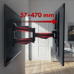 Deze duurzame muurbeugel maakt het gemakkelijk om uw tv in de woonkamer, slaapkamer of werkkamer te plaatsen. Dankzij de dubbele gewrichtsarm kunt u de tv 57–470 mm van de muur uittrekken, naar de gewenste hoek draaien en kantelen in het bereik van +2° tot -12° voor een perfect zicht zonder reflecties.